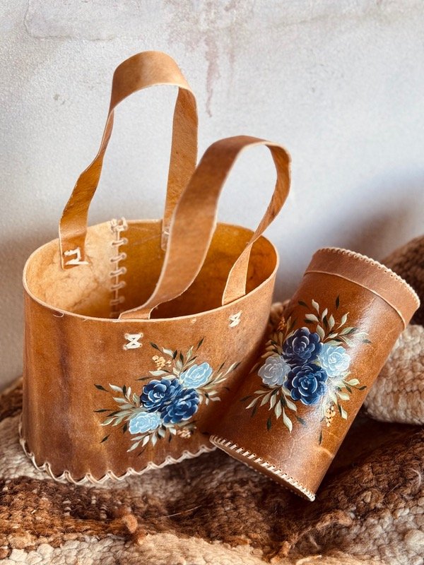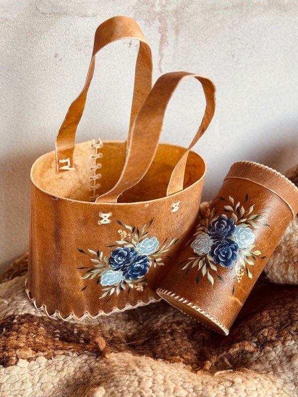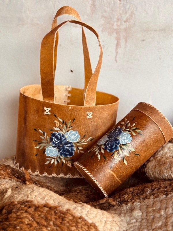 Matera rígida hecha artesanalmente en cuero crudo, con detalles cosidos y manija firme también de cuero. Pintada a mano, cada una es única y refleja el cuidado en cada trazo. Ideal para acompañar tus momentos materos con un objeto funcional y lleno de identidad.