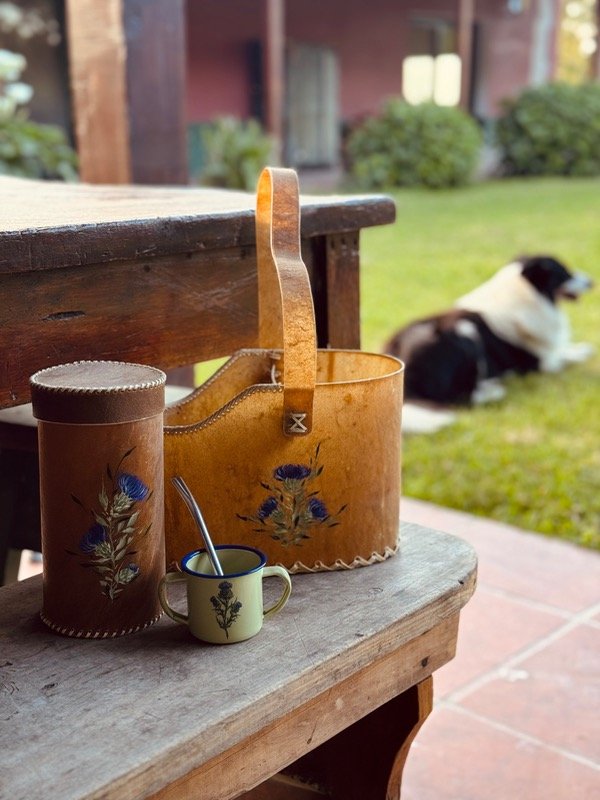 Matera rígida hecha artesanalmente en cuero crudo, con detalles cosidos y manija firme también de cuero. Pintada a mano, cada una es única y refleja el cuidado en cada trazo. Ideal para acompañar tus momentos materos con un objeto funcional y lleno de identidad.