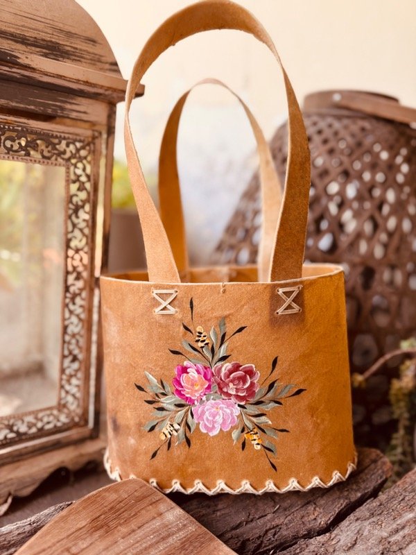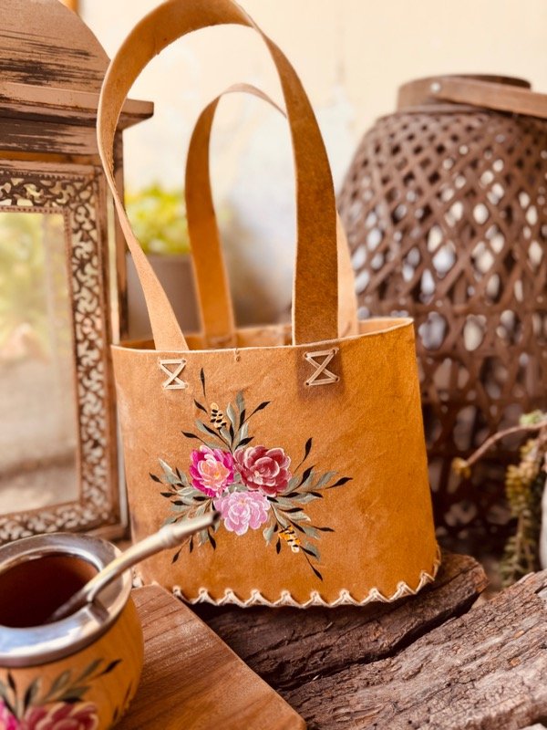 Matera rígida hecha artesanalmente en cuero crudo, con detalles cosidos y manija firme también de cuero. Pintada a mano, cada una es única y refleja el cuidado en cada trazo. Ideal para acompañar tus momentos materos con un objeto funcional y lleno de identidad.