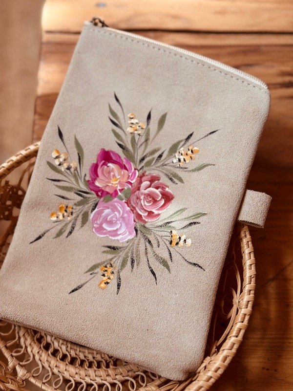 Una pieza única que combina lo artesanal con lo funcional. Hecha en cuero gamuzado de tono cálido, cada yerbera está intervenida a mano con delicadas flores pintadas, convirtiéndola en mucho más que un accesorio: es una obra de arte para tu ritual del mate.