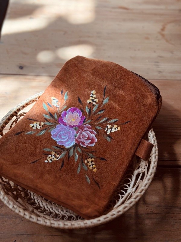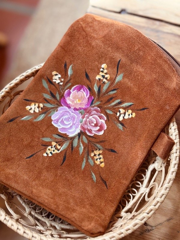 Una pieza única que combina lo artesanal con lo funcional. Hecha en cuero gamuzado de tono cálido, cada yerbera está intervenida a mano con delicadas flores pintadas, convirtiéndola en mucho más que un accesorio: es una obra de arte para tu ritual del mate.