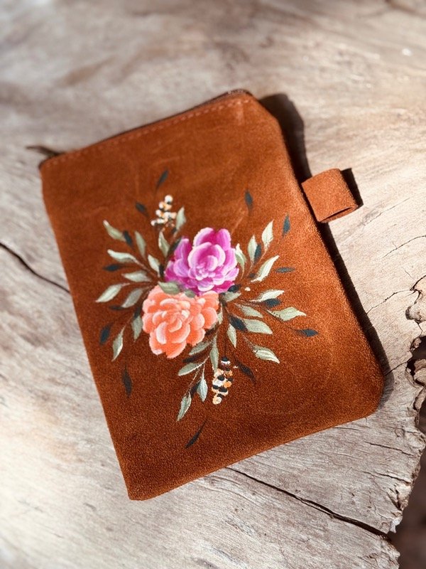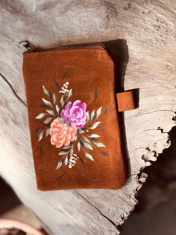 Una pieza única que combina lo artesanal con lo funcional. Hecha en cuero gamuzado de tono cálido, cada yerbera está intervenida a mano con delicadas flores pintadas, convirtiéndola en mucho más que un accesorio: es una obra de arte para tu ritual del mate.