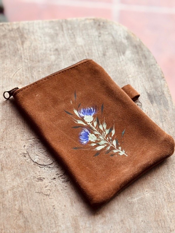 Una pieza única que combina lo artesanal con lo funcional. Hecha en cuero gamuzado, cada yerbera está intervenida a mano, convirtiéndola en mucho más que un accesorio: es una obra de arte para tu ritual del mate.