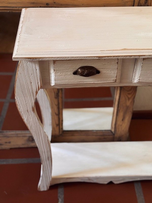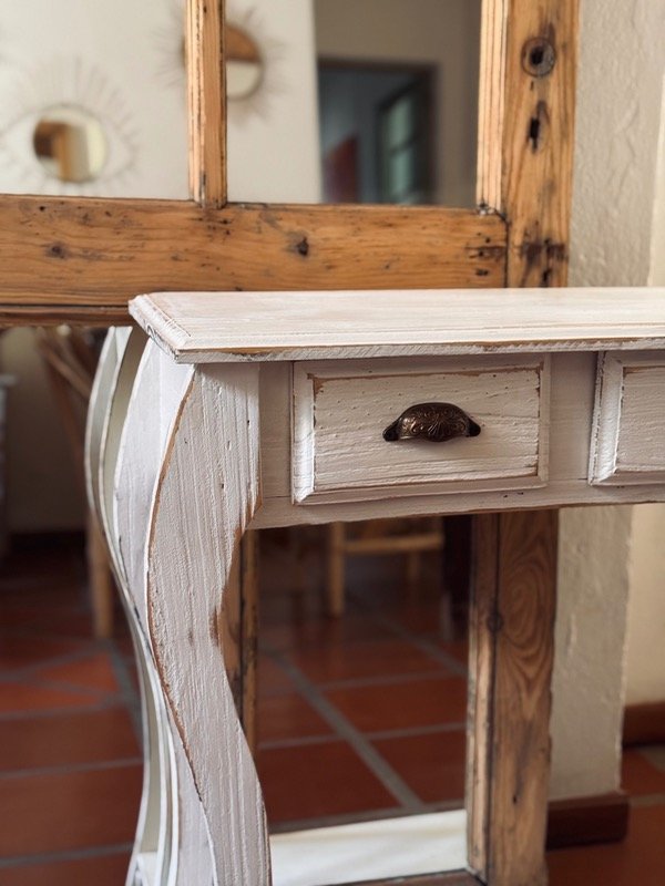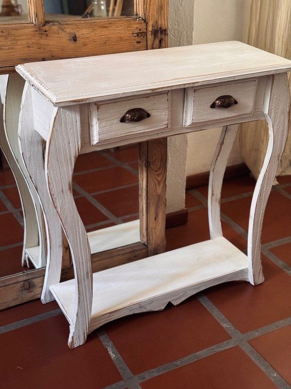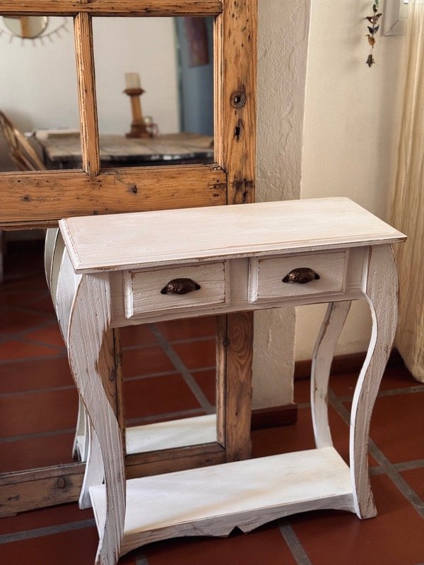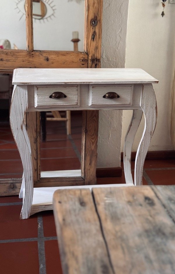 Está hecha en pino macizo, con líneas curvas que la hacen súper femenina y elegante. Tiene dos cajones funcionales y los tiradores son de bronce envejecido, que le aportan ese toque clásico y cálido que combina perfecto con cualquier ambiente.